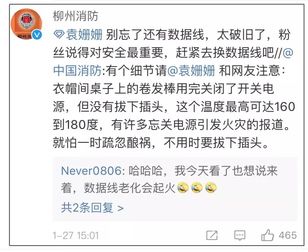 袁姍姍本人隨後也在微博回應了嚴格的阿消:感謝提醒,消防知識要牢記!一定改正!追求幸福生活!