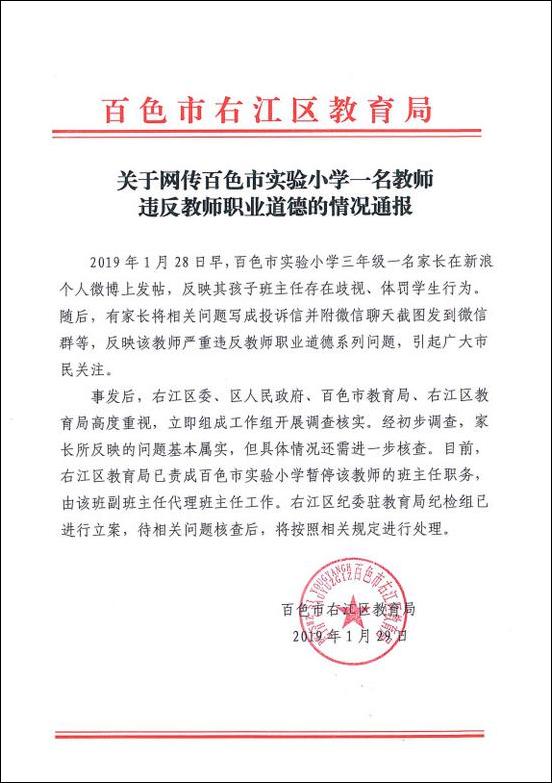 上述爆料內容很快引發網友關注,1月29日,百色市右江區新聞中心通過其官方微信發佈落款為百色市右江區教育局的《關於網傳百色市實驗小學一名教師違反教師職業道德的情況通報》,通報稱,目前當地有關部門已就此事成立工作組。經初步調查,家長所反映的問題基本屬實,但具體情況還需進一步核查。