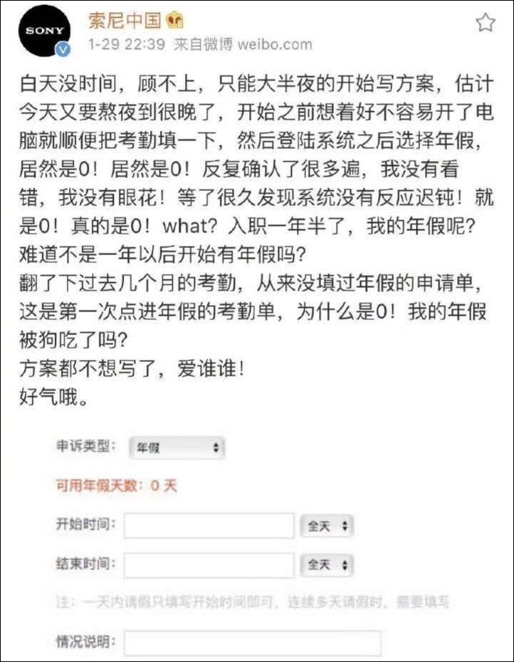 29日晚,@索尼中國 的小編通過官方微博賬號吐槽,晚上熬夜加班寫方案不説,沒想到工作一年半了,2019年的年假仍舊為0,“年假被狗吃了嗎?”