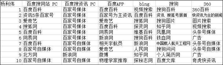 用多個搜索引擎搜關鍵詞“楊利偉”呈現結果