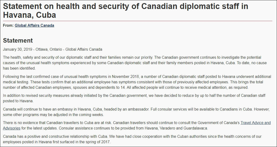 聲明最後説,加拿大繼續保持與古巴政府積極和有建設性的關係。兩國政府自2017年春天首次案例出現後便一直保持密切合作。