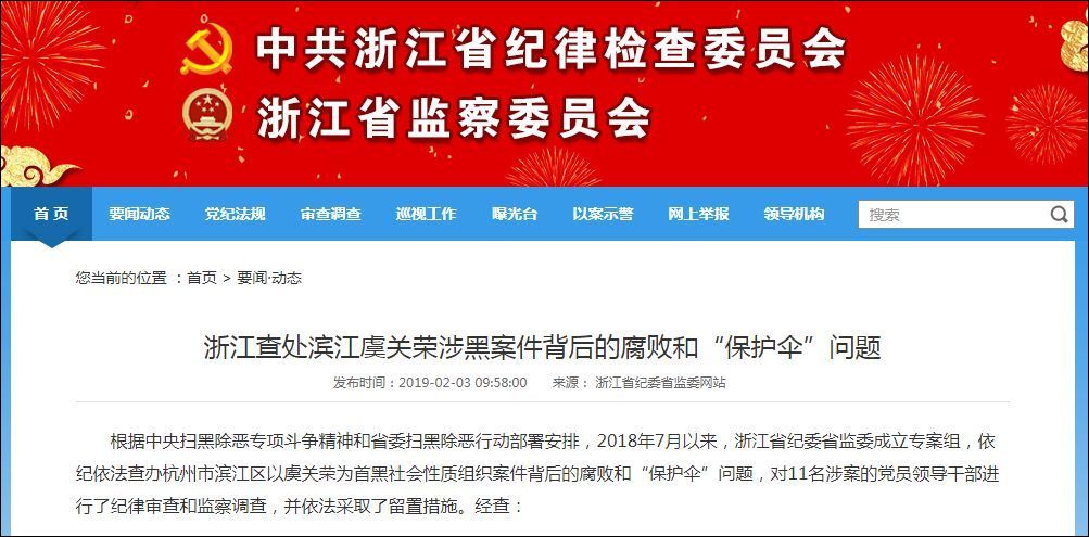 8天前,除夕,浙江省紀委監委曾發佈,查處濱江虞關榮涉黑案件背後的腐敗和“保護傘”問題,對11名涉案的黨員領導幹部進行了紀律審查和監察調查,並依法採取了留置措施。