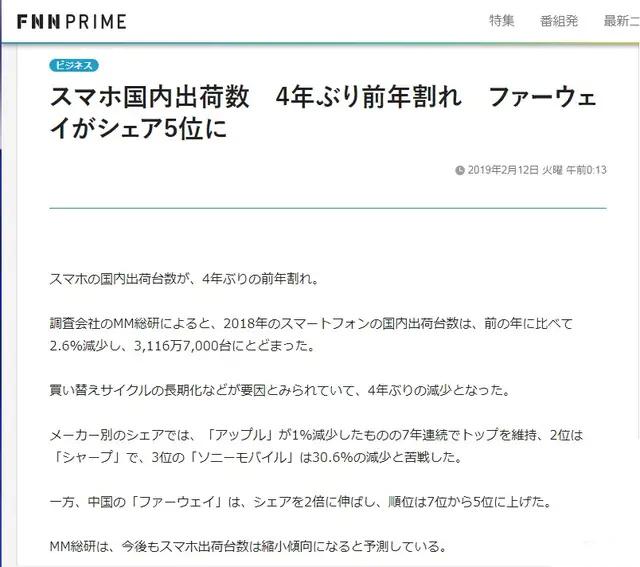 華為手機在日本的銷量與日俱增。據《日本經濟新聞》報道,日本調查諮詢公司MM綜研彙總的數據顯示,2018年日本國內的智能手機出貨量降至3116.7萬部,比2017年減少2.6%。為4年來首次下滑。其中,華為已進入2018年日本智能手機銷量第5位。