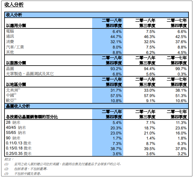 按照工藝劃分的收入佔比分別為:28nm 5.4%、40/45nm 20.3%、55/65nm 23.0%、90nm 1.7%、110/130nm 7.3%、150/180nm 38.7%、250/350nm 3.6%。