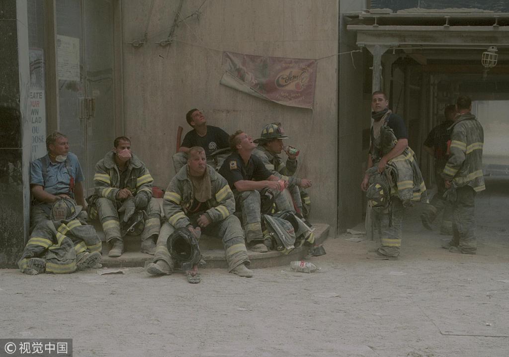 2001年9月11日,美國世貿大樓遭受兩架飛機撞擊起火倒塌,消防隊員奮力救火後,累極就地休息。@視覺中國