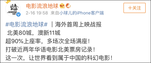 值得一提的是,@電影流浪地球 昨晚還曾發佈微博公佈海外首週上映戰報,成績喜人。