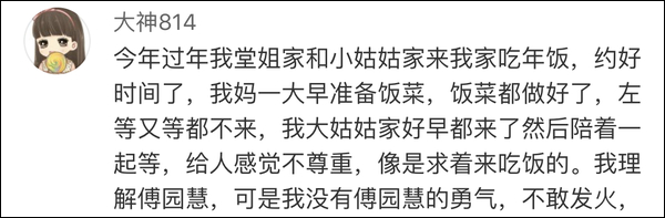 傅園慧對於這頓飯前後幾次的情緒失控成為了網友們最熱議的話題,有些網友理解傅園慧的不滿,認為她只是很直率地做出了別人不敢做的事,畢竟有錯在先的是遲到了近3個小時的親戚們。