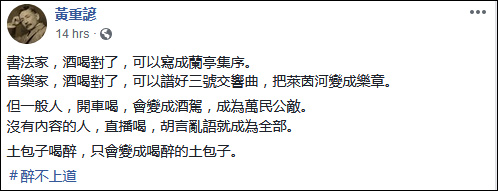 “蔡辦”發言人黃重諺在社交媒體臉書上發文稱,“書法家,酒喝對了,可以寫成蘭亭集序;音樂家,酒喝對了,可以譜好三號交響曲,把萊茵河變成樂章。但一般人,開車喝,會變成酒駕,成為萬民公敵;沒有內容的人,直播喝,胡言亂語就成為全部。”最後還諷刺韓國瑜“土包子喝醉,這樣只會變成喝醉的土包子”。