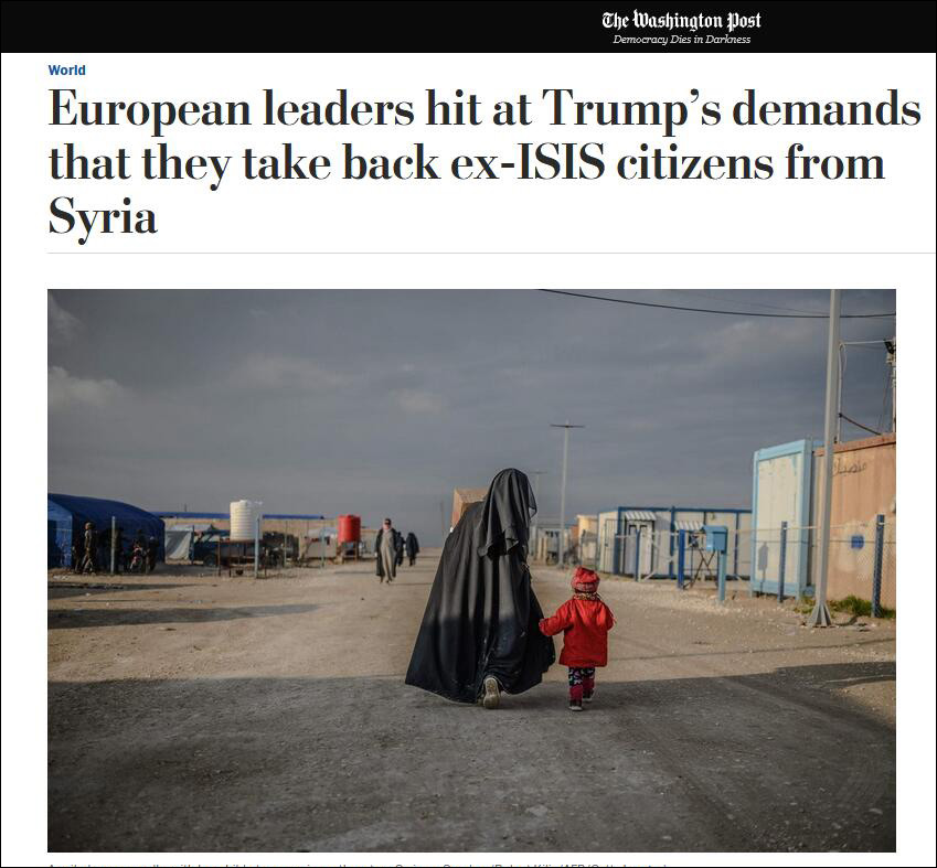 目前,數百名被抓獲的IS武裝分子正被得到美國人支持的庫爾德武裝關押在敍利亞東北部。曾與IS武裝分子建立家庭,不參加戰鬥的數千名婦女與兒童則被留置在庫爾德人嚴密控制的難民營中。他們當中許多人都是歐洲公民。