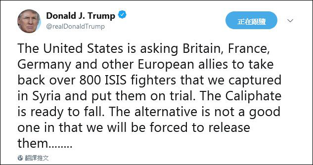 16日晚,一直強調IS已被基本消滅,同時心繫“撤軍”的特朗普在推特上寫道:“美國要求英國、法國、德國及其他歐洲盟國接回我們在敍利亞抓獲的800多名IS武裝分子,並對他們進行審判。IS要垮台了。(歐洲如果不這樣做)另一種選擇可不是什麼好辦法,我們將被迫釋放他們。”