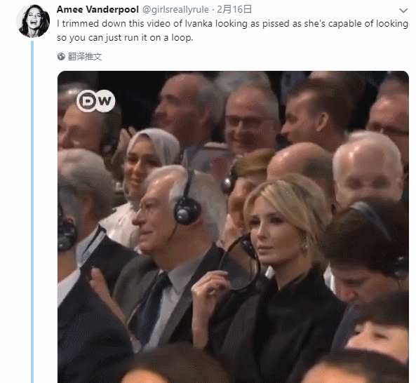 推特網民也注意到慕尼黑會議上尷尬景象。有網民認為,伊萬卡是唯一不鼓掌的聽眾。