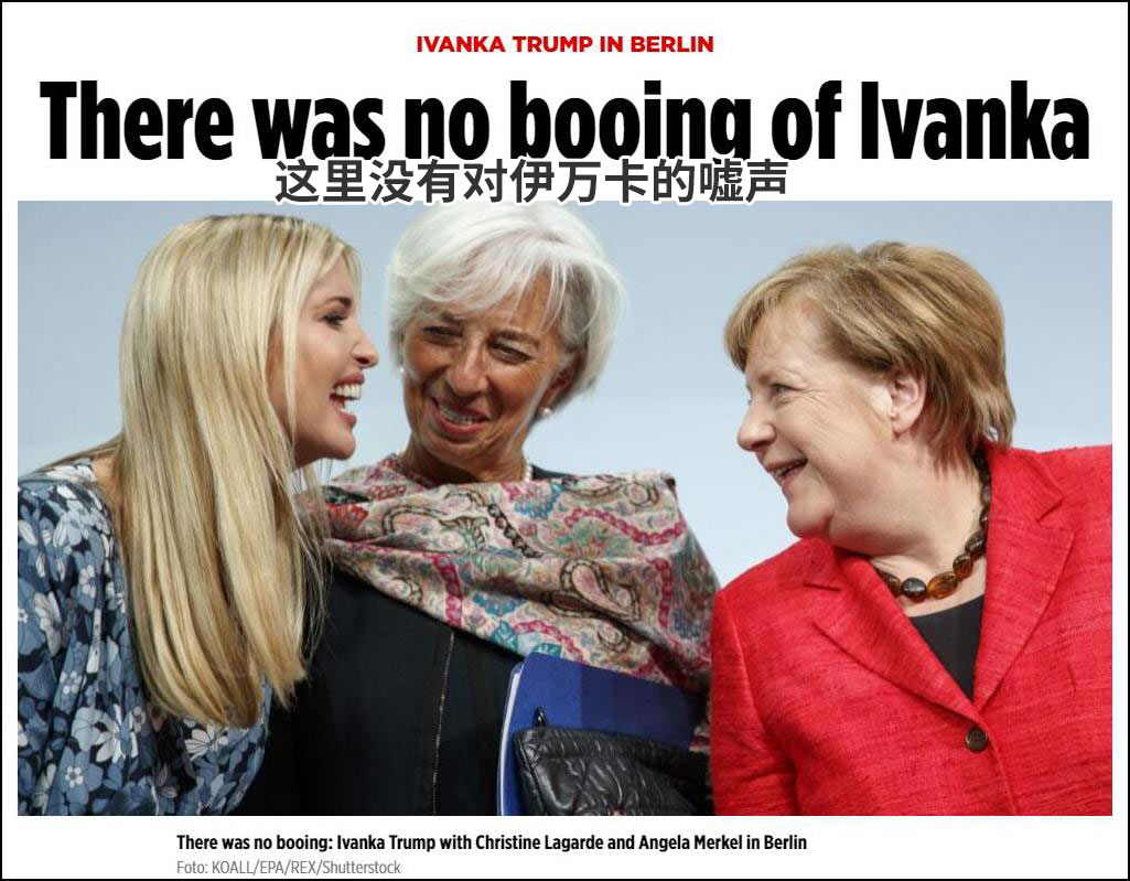德國《圖片報》17年4月介紹,伊萬卡作為總統顧問在柏林出席會議時,美媒稱她遭到各方“嘲笑”,但在德媒眼中,伊萬卡同默克爾相處得不賴,對“嘲笑”進行了澄清。同時一張相視而笑的照片予以佐證。