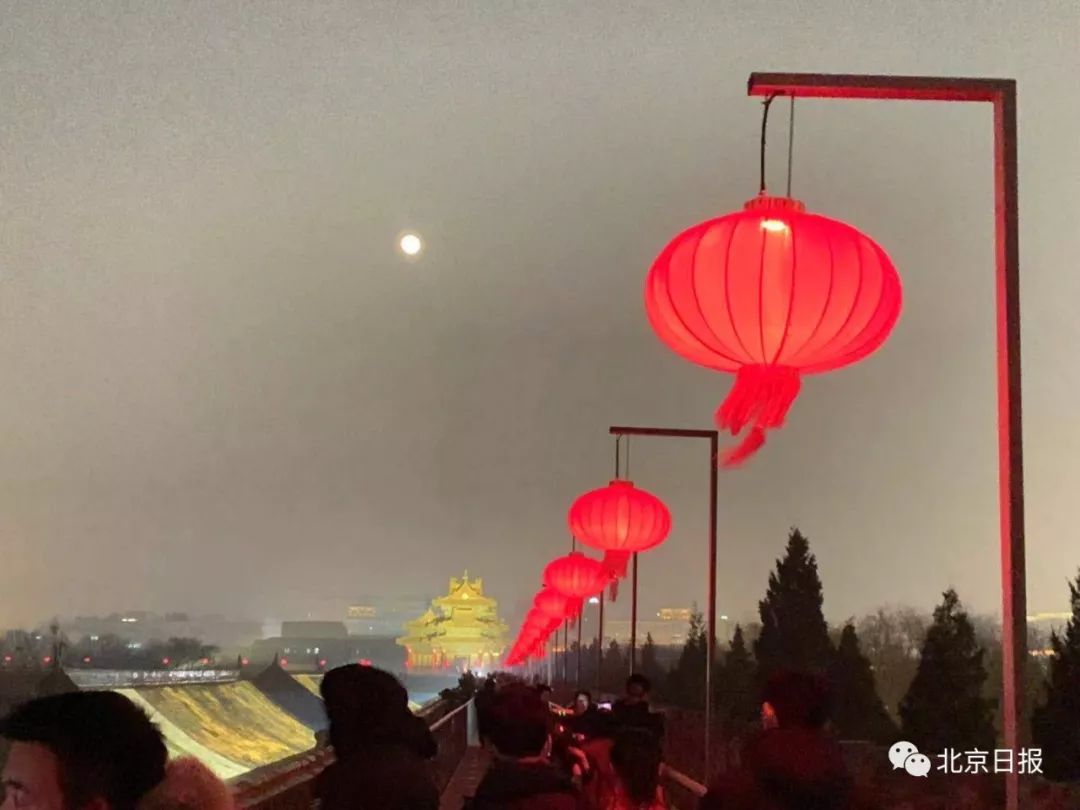 紅色宮牆、城樓牆壁上,“有燈無月不娛人,有月無燈不算春”“鳷鵲樓前新月滿,鳳凰台上寶燈燃”等與元宵節有關的詩句被打出,吸引遊客誦讀。配合着今晚的“超級月亮”,可謂是別有一番意境。