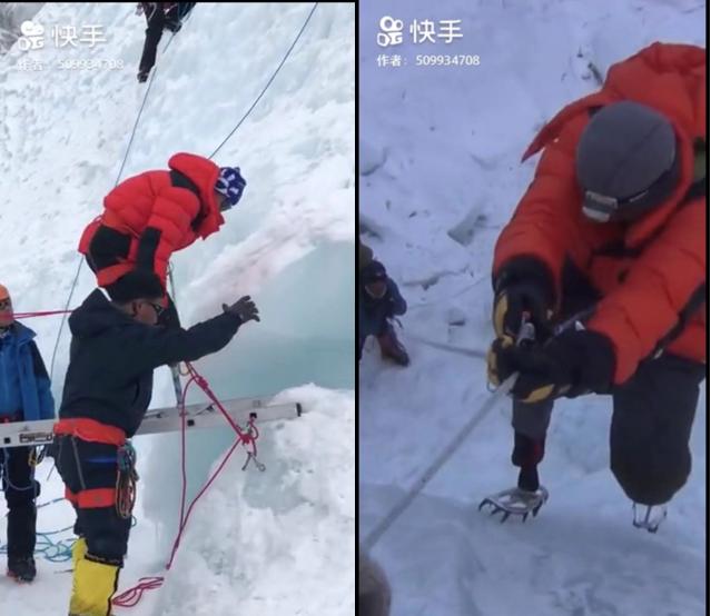 在一條“論訓練的重要性”的視頻中,他記錄下自己在5400米珠峯大本營的訓練過程。對於普通登山者非常簡單的穿着冰爪在鋼梯上行進的動作,佩戴義肢夏伯渝因為對地面缺乏知覺,卻需要反覆訓練才能在鋼梯上站穩、走穩,不至於跌倒。