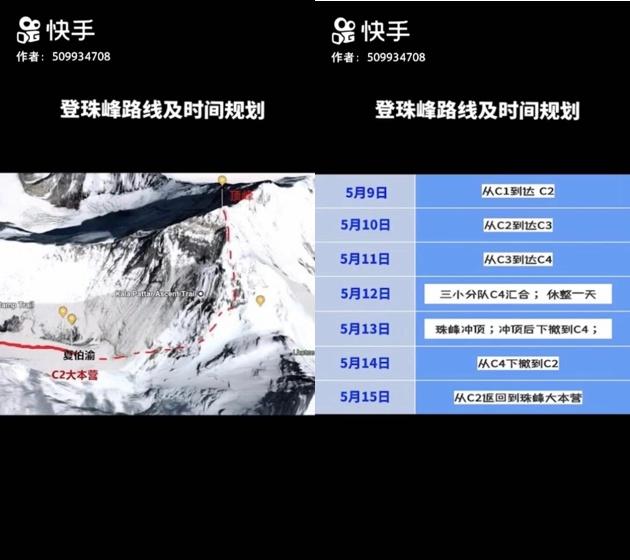 在視頻中,夏伯渝還公佈了自己登頂珠峯的路線及時間規劃。“5月9日,從C1到達C2;5月10日,從C2到達C3;5月11日,從C3到達C4;5月12日,三小分隊C4集合,休整一天……5月13日,珠峯衝頂;衝頂後下車到C4……”
