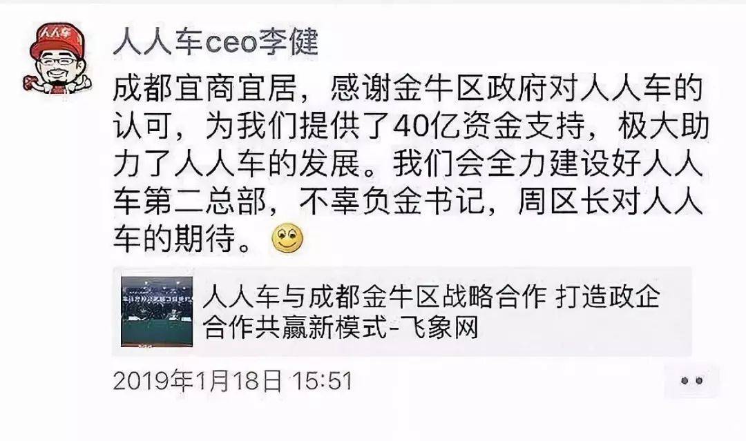 值得注意的是,陷入“裁員”傳聞中的人人車在今年1月初卻有了新的融資進展。1月18日,人人車CEO李健在朋友圈高調宣佈,人人車獲得了成都金牛區政府40億元資金支持,同時人人車將在成都設立第二總部。但之後不久,李健又悄悄地將這條信息刪除。