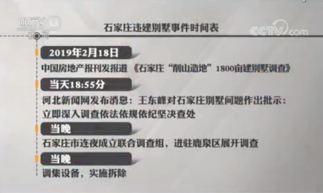 就在河北省委主要領導作出批示的同一天,石家莊市當即成立調查組,進駐別墅所在地鹿泉區。經查實,該項目獲批300畝,已佔地面積229畝,其中19畝沒有取得土地合法手續。