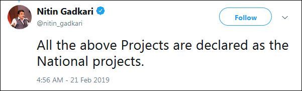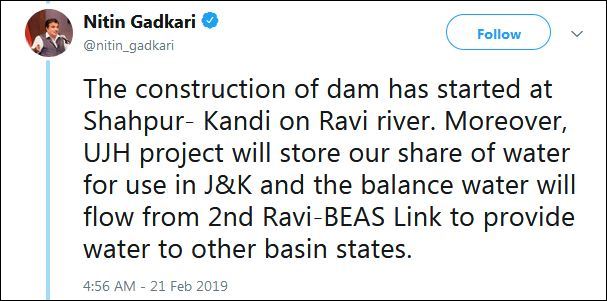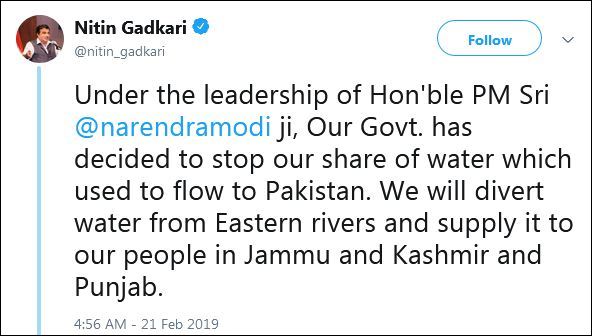 2月21日,尼鋌·加德卡里連發3條推特,表示要建水壩,阻止印度河上游東邊3條河流的水流向巴基斯坦。