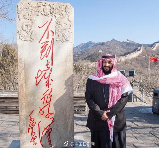 @中國日報網2月22日消息,據阿拉伯國有電視台Al Arabiya報道,沙特王儲穆罕默德·本·薩勒曼訪華首日,遊覽了八達嶺長城,駐足觀看毛澤東題詞“不到長城非好漢”的石碑,並合影留念。
