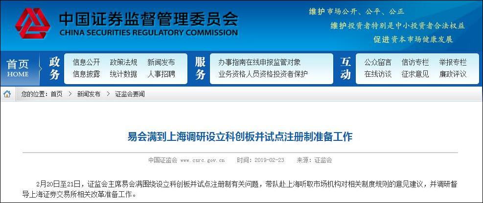 據證監會官網消息,2月20日至21日,證監會主席易會滿圍繞設立科創板並試點註冊制有關問題,帶隊赴上海聽取市場機構對相關制度規則的意見建議,並調研督導上海證券交易所相關改革準備工作。