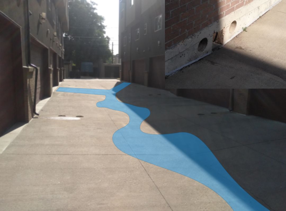 這張圖片也是丹佛。我們剛才説在綠地和綠地之間,預留出徑流的通道,方法很簡單,讓兩邊道路往中間傾斜,開幾個小孔,就有了水可以走的路線。