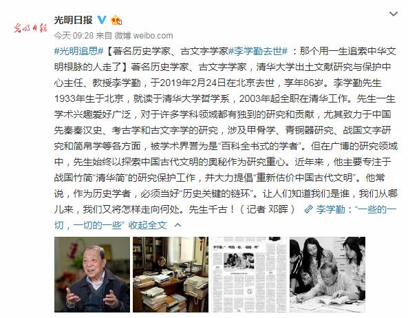 著名歷史學家、古文字學家,清華大學出土文獻研究與保護中心主任、教授李學勤,於2019年2月24日在北京去世,享年86歲。
