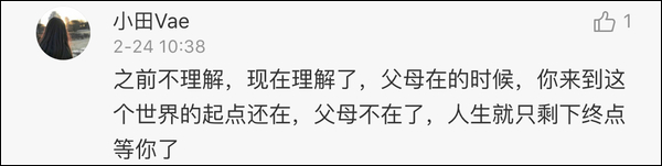 這大概也就是我們常説的“父母在,人生尚有來處;父母去,人生只剩歸途。”這句直擊內心的慷慨箴言,戳中了很多人的淚點。