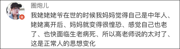 有網友根據自己的親身經歷發表感性評論:“我外婆去世之後,我媽開始真誠地告訴我,我該為自己的婚姻大事考慮一下,不要活的那麼獨。看完高老師的話,我也有所理解了。”