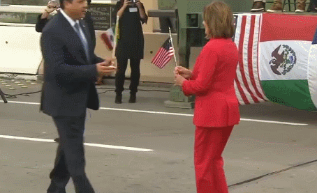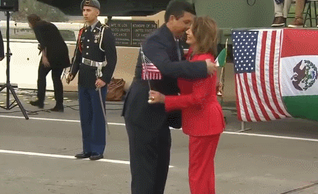 在儀式上,佩洛西與墨西哥官員擁抱,並交換國旗。組織方稱兩人擁抱是當天慶祝儀式一部分,象徵着“兩個鄰國間的友好和諒解”。