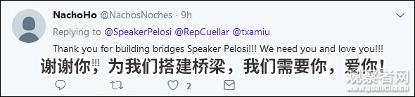 佩洛西參加橋樑儀式,顯然是與大呼建牆的特朗普對着幹。在推特上,有人對佩洛西表達了支持。