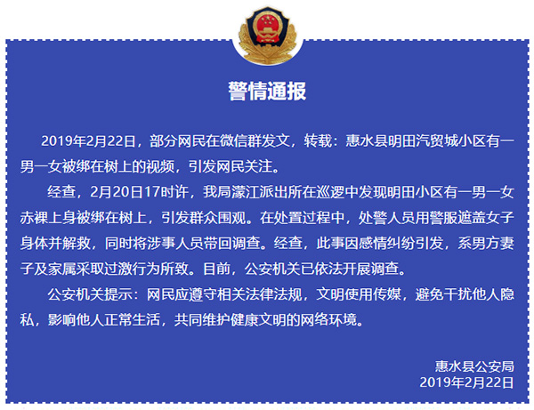 經查,2月20日17時許,我局濛江派出所在巡邏中發現明田小區有一男一女赤裸上身被綁在樹上,引發羣眾圍觀。在處置過程中,處警人員用警服遮蓋女子身體並解救,同時將涉事人員帶回調查。經查,此事因感情糾紛引發,系男方妻子及家屬採取過激行為所致。目前,公安機關已依法開展調查。