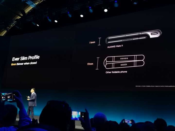 根據華為官方的説法,展開後的Mate X最小厚度為5.4毫米,優於新iPad Pro和其他摺疊手機;另外,摺疊後則為11毫米,較競爭對手薄6毫米。