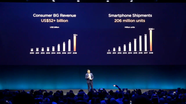 2018年,華為消費者BG的總收入超過520億美元,智能手機出貨量超過2.06億台。此外,華為智能設備的總出貨量超過一億台,其中平板電腦出貨量增長14%、PC出貨量增長335%、可穿戴設備的出貨量增長120%。