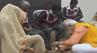 祭河神儀式結束後,莫迪在印度飲水和衞生部組織的活動期間接見了在當地“城市清潔任務”項目中做出傑出貢獻的工作人員,並親自為他們洗腳,以示敬意。