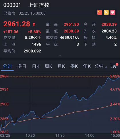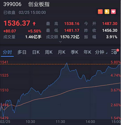 截至收盤,上證指數報2961.28點,漲5.60%,成交額為4659.91億元;深證成指報9134.58點,漲5.59%,成交額為5746.89億元;創業板指報1536.37點,漲5.50%,成交額達到1570.72億元。