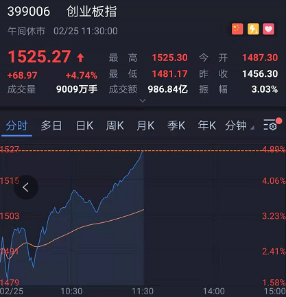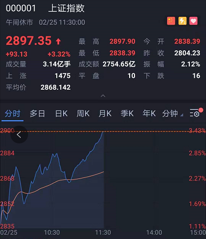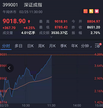 截至上午收盤,上證指數報2897.35點,漲3.32%,成交額為2754.65億元;深證成指報9018.90點,漲4.25%,成交額為3530.37億元;創業板指報1525.27點,漲4.74%,成交額達到986.84億元。
