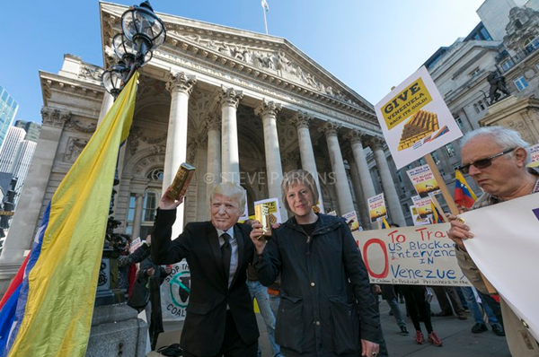 英國倫敦,民眾在英國中央銀行前,手舉“把黃金還給委內瑞拉”標語,抗議英國和特朗普政府沆瀣一氣。