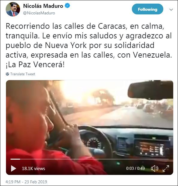 馬杜羅24日也在推特發文對抗議活動致意:“感謝紐約人民在街頭對委內瑞拉的積極聲援,和平會實現!”