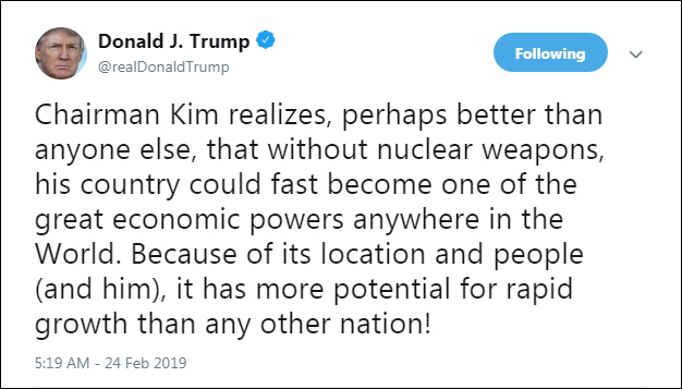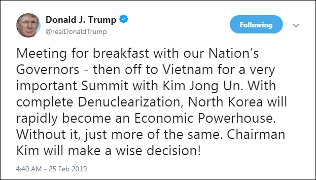 “將與我國的州長們共進早餐,然後出發前往越南與金正恩進行非常重要的會談。如果朝鮮選擇完全棄核,將會迅速爆發出經濟增長的動力;如果拒絕,朝鮮恐怕還會是老樣子。金主席會做出明智的決定!”