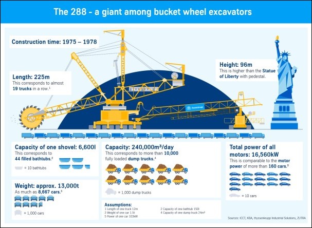 從體型上來看,Bagger 288是不折不扣的“巨無霸”:高96米,比自由女神像還要高;臂展225米,相當於19輛卡車連在一起;重達12840噸,需要12條履帶助其前進,最高速度下Bagger每分鐘只能走10米。