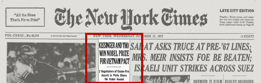 1973年10月17日,《紐約時報》頭版報道基辛格與黎德壽獲諾貝爾獎