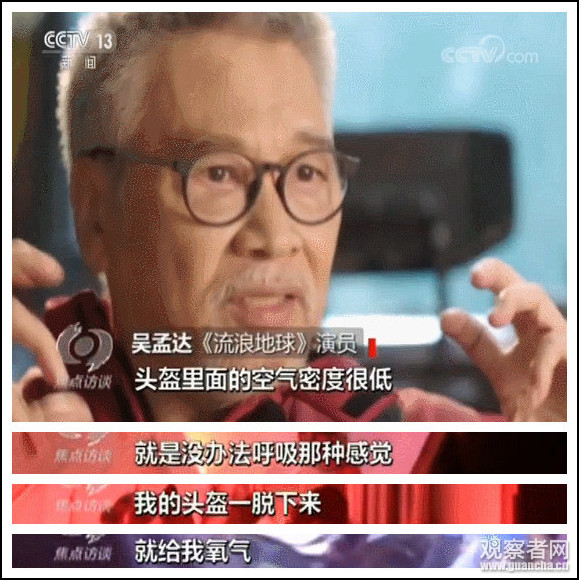 為了配合電影設置的大背景——地球即將毀滅,人大多是在極端環境之下活動。《流浪地球》在拍攝時,演員們的戲服是特製的盔甲,沉重而且密閉不透氣,主演吳孟達介紹,每次把頭盔拿下來,都要立刻吸氧。