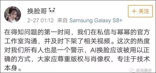 27日凌晨,引發這場熱議的製作者回應已將相關視頻下架,並表示:“對所有人來説是一個警示,大家應尊重版權與肖像權,專注於技術本身。”