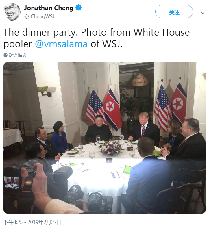 據CNN報道,白宮發言人桑德斯公佈了特朗普與金正恩晚宴的陪同人員名單,美方派出了美國國務卿蓬佩奧、代理白宮幕僚長馬爾瓦尼及1名翻譯;朝方則是朝鮮勞動黨中央委員會副委員長金英哲、朝鮮外務相李勇浩及1名翻譯。