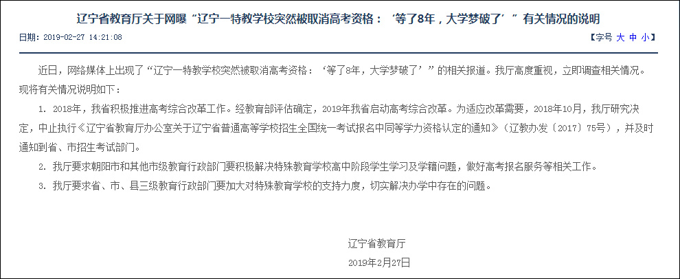 (觀察者網訊)2月27日,針對近日網絡媒體出現的“遼寧一特殊教育學校突然被取消高考資格:等了8年,大學夢破了”的相關報道,遼寧省教育廳官網發佈情況説明。説明中指出,為適應改革需要,2018年10月,遼寧省廳研究決定,中止執行《遼寧省教育廳辦公室關於遼寧省普通高等學校招生全國統一考試報名中同等學力資格認定的通知》。