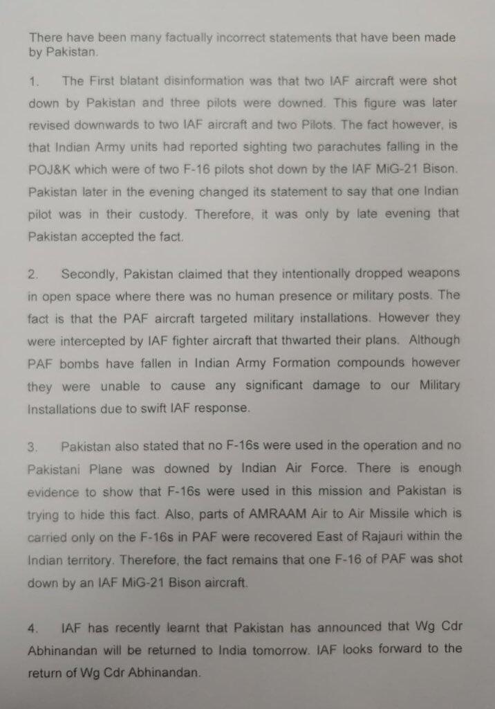 聲明還駁斥了巴方此前聲稱“擊落兩架印度戰機”的説法,僅承認一架米格-21被擊落,一名飛行員被巴軍俘虜。對於巴總理伊姆蘭·汗宣佈週五放人的承諾,聲明表示歡迎。