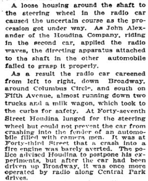 但遺憾的是,因為技術並不成熟,在紐約最繁忙的道路上的測試意外不斷,遠稱不上成功。這輛車從百老匯一直行駛到第五大道,途中險情連連,甚至與載有攝影師的專車和消防車發生了碰撞,儘管警察要求其暫停測試,但倔強的工程師又在中央公園路進行了測試。