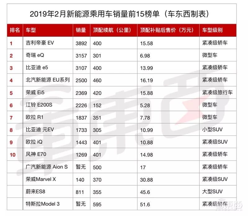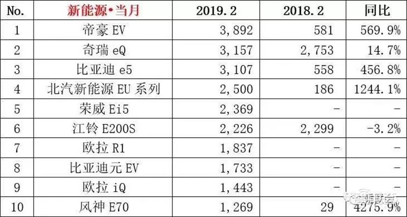 下表為乘聯會統計的2019年2月新能源乘用車(插混+純電)銷量前10名榜單,即使是第10名的風神E70,銷量也達到了1269台,遠超Marvel X的140台。