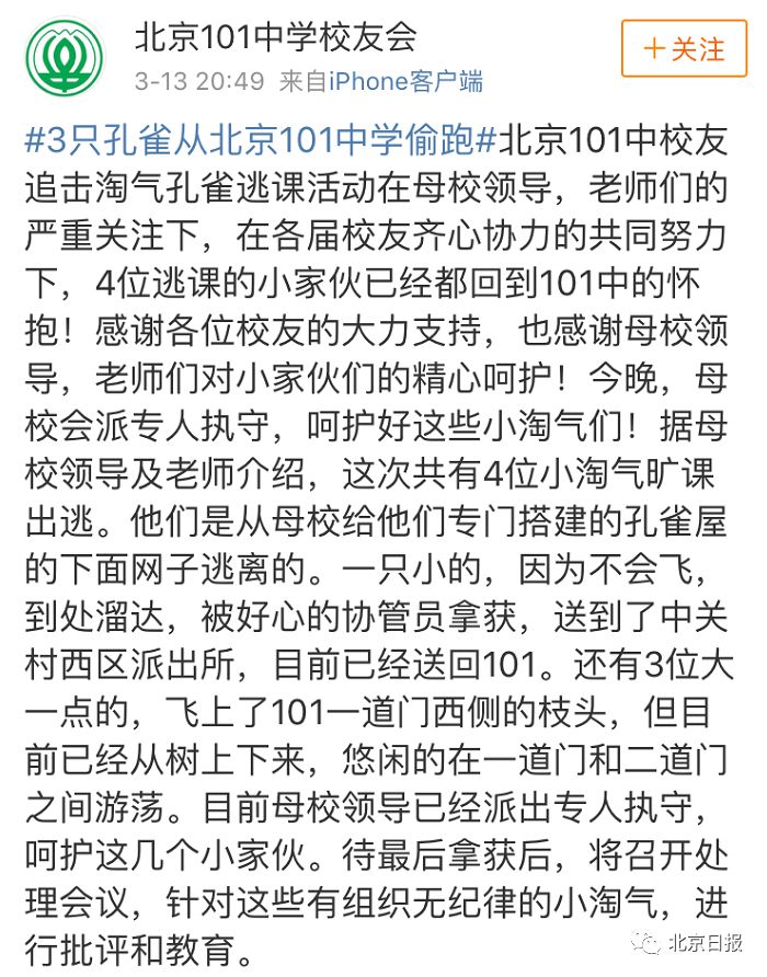 昨天下午,“3只孔雀從北京101中學偷跑”的消息引發了廣泛關注。