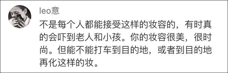 當事網友感言:其實一開始我不太敢發出來,因為肯定會有“都怪你怎麼化這種妝”的人存在,而且這種人就算是解釋了ta也不會接受,但是轉發評論的姐妹們絕大多數都認識到要點:不是要不要這樣做,而是能不能這樣做。